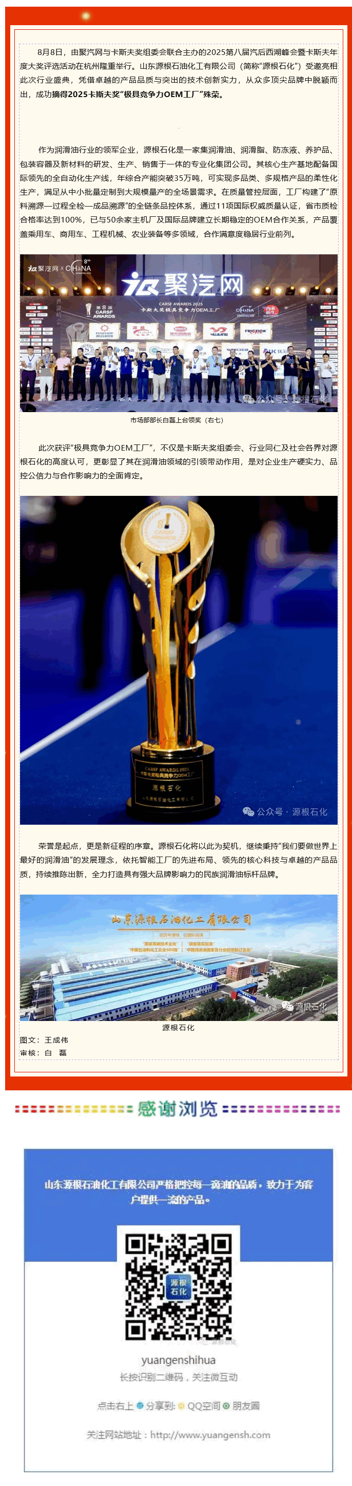 热烈祝贺源根石化斩获2025卡斯夫奖“极具竞争力OEM工厂”荣誉